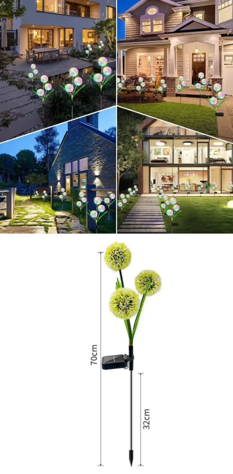 Садовий ліхтар на сонячній батареї у формі кульбаби — це яскравий декоративний елемент, який створює справжню магію у вашому саду. Завдяки RGB-підсвітці світильник змінює кольори, створюючи ефект казкового сяйва.